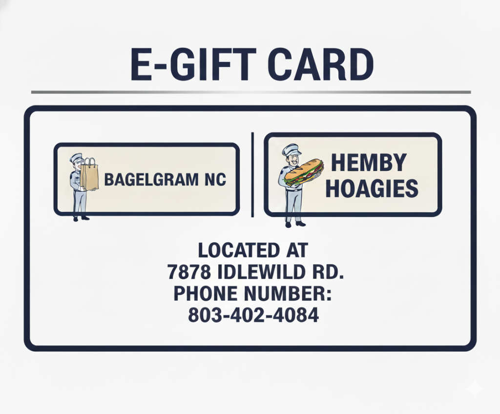 Our In-Store E-Gift Cards can be purchased through this website HERE and can be used for BagelGram NC and Hemby Hoagies.