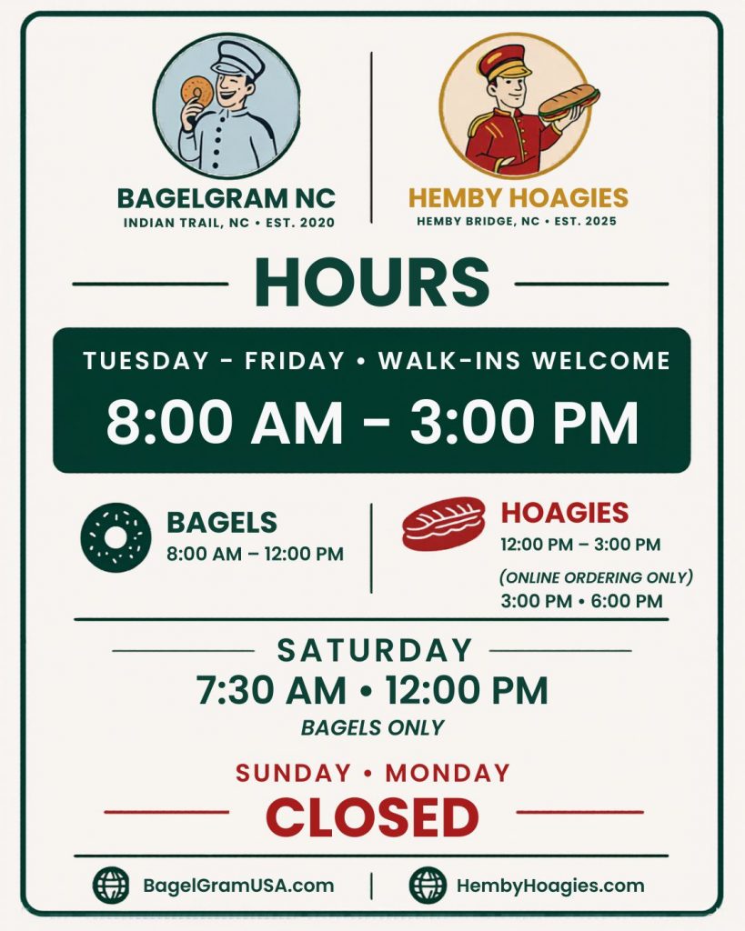 Our In-Store E-Gift Cards can be purchased through this website HERE and can be used for BagelGram NC and Hemby Hoagies.